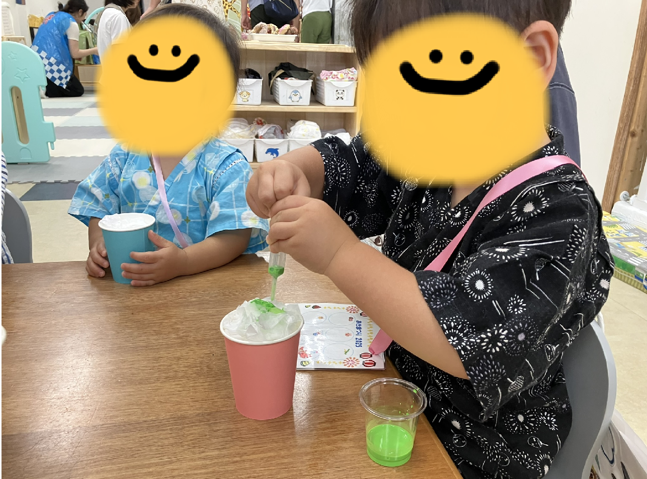 かき氷屋さんでは好きな色のシロップを自分でかけて